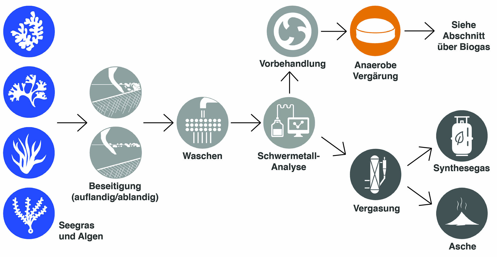 Basierend auf derzeit verwendeten Techniken, wird Seegras (Makroalgen) entlang der Küstenlinie an Stränden (auflandig) und im flachen Wasser nahe der Strände (ablandig) gesammelt. Zunächst wird die Algenbiomasse gesiebt und gewaschen. Das gereinigte Material kann zusammen mit anderen Reststoffen in einer Biogasanlagen oder einer Abwasserbehandlungsanlage mithilfe der sauerstofffreien (anaeroben) Zersetzung (Vergärung) fermentiert werden. Das entstehende Biogas kann genutzt werden, um ein Blockheizkraftwerk anzutreiben oder zu Biomethan veredelt werden. Allerdings können je nach Saison und Region die Schwellenwerte von Schadstoffen überschritten werden. In diesem Fall können andere Verwertungsmöglichkeiten für die organischen Reststoffe gefunden werden.