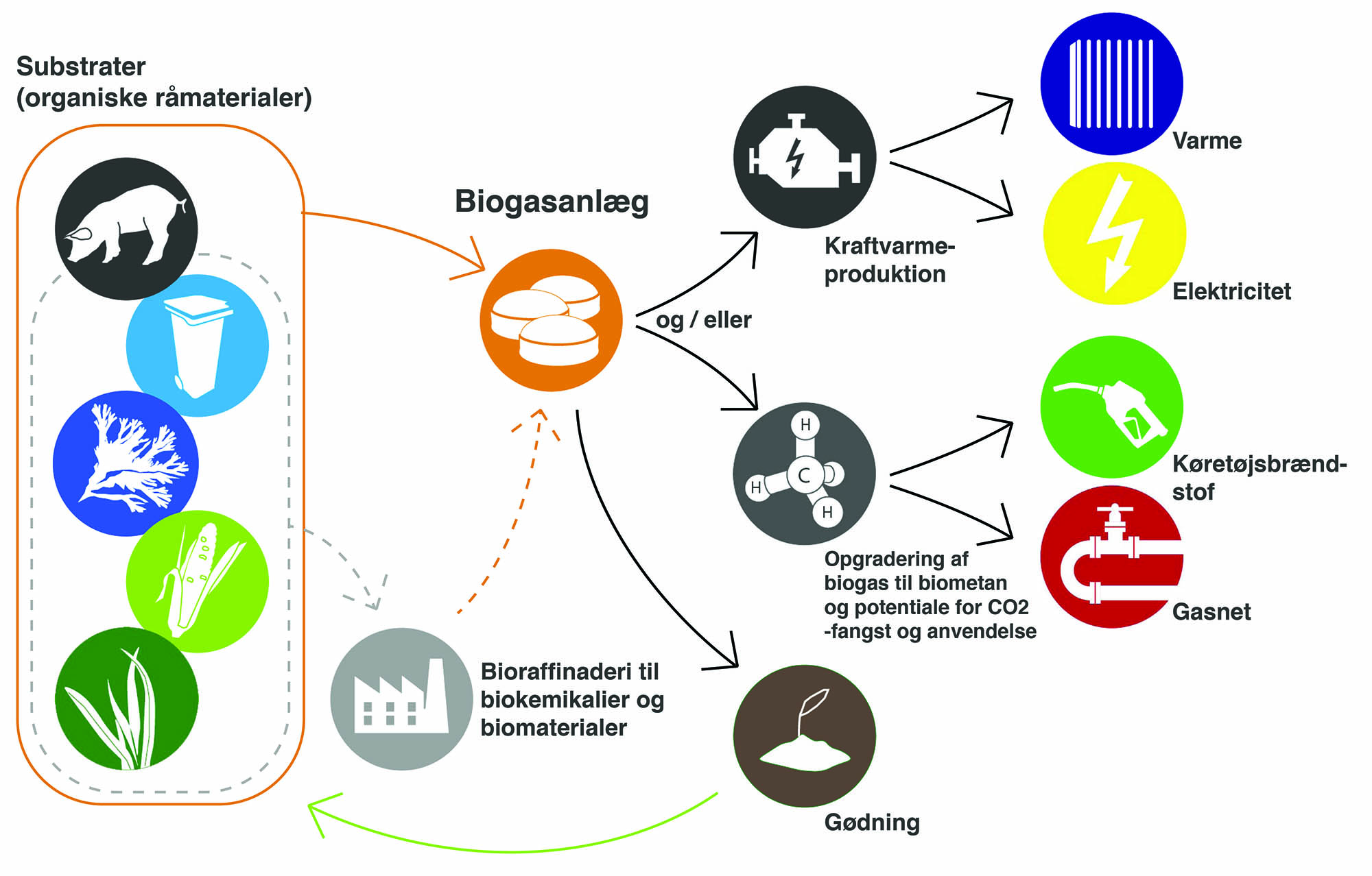 Organisk affald kan ofte bruges som input til biogasanlæg. I biogasanlægget omdannes organisk affald under anaerobe forhold (uden ilt) til biogas, der kan bruges i kombinerede kraftvarmeværker til at producere elektricitet og varme. En anden almindelig mulighed er at opgradere biogassen til biometan, som kan anvendes som brændstof i transportsektoren. Ud over energi efterlader produktionen også et restprodukt – det anaerobisk nedbrudte materiale, kaldet digestat. Digestaten er en højkvalitets gødning, der kan anvendes i landbruget.