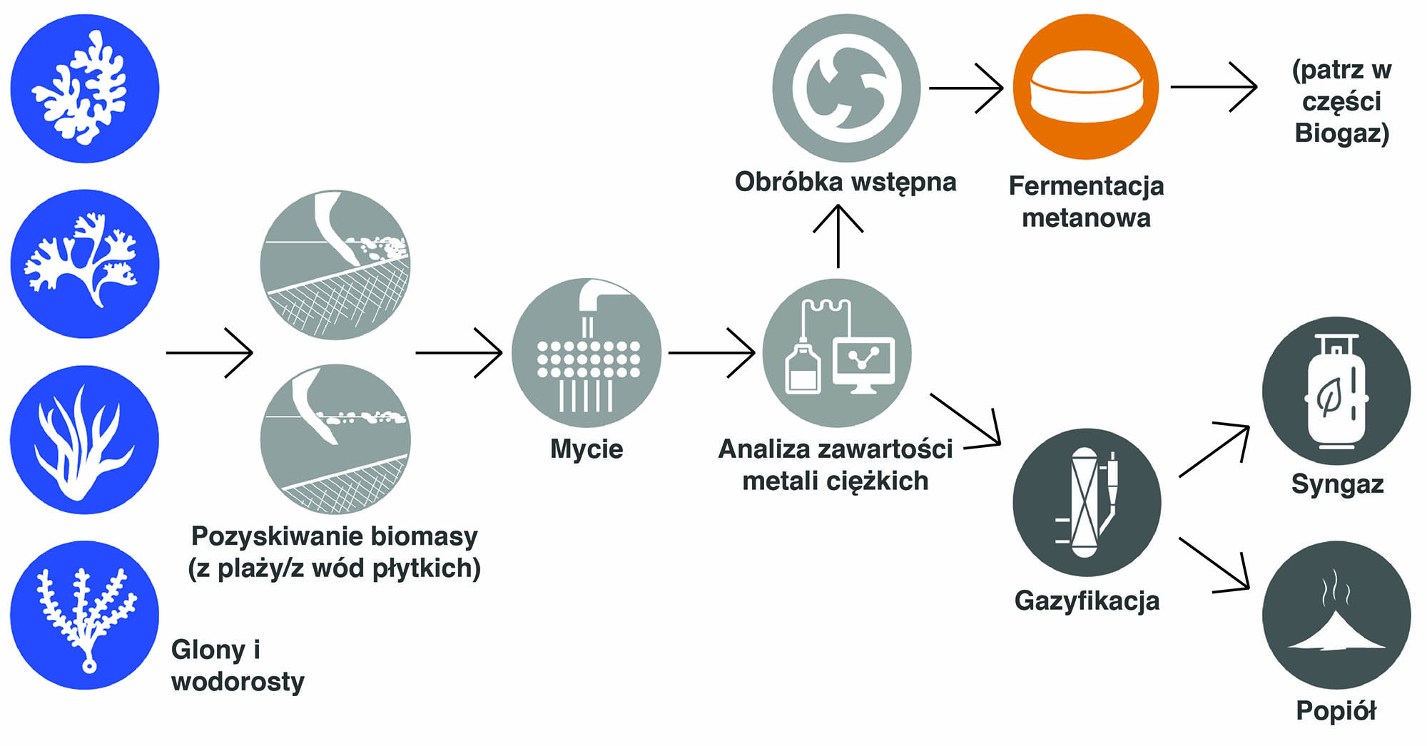 W oparciu o obecnie stosowane techniki, wodorosty (makroalgi) są zbierane na plaży wzdłuż linii brzegowej (na lądzie) oraz w płytkiej wodzie w pobliżu plaży (na morzu). Wstępnie, biomasa morska poddawana jest obróbce w procesie przesiewania i mycia. Oczyszczony materiał można poddać kofermentacji z inną biomasą w procesie beztlenowej fermentacji metanowej w biogazowni lub oczyszczalni ścieków. Biogaz może być wykorzystywany energetycznie w układach kogeneracyjnych lub uzdatniony do biometanu. W zależności od pory roku i regionu zawartość zanieczyszczeń w pozyskiwanej biomasie morskiej może przekraczać dopuszczalne wartości dla surowców nawozowych. W takich przypadkach proponuje się inne zastosowania pozostałości biomasy morskiej.
